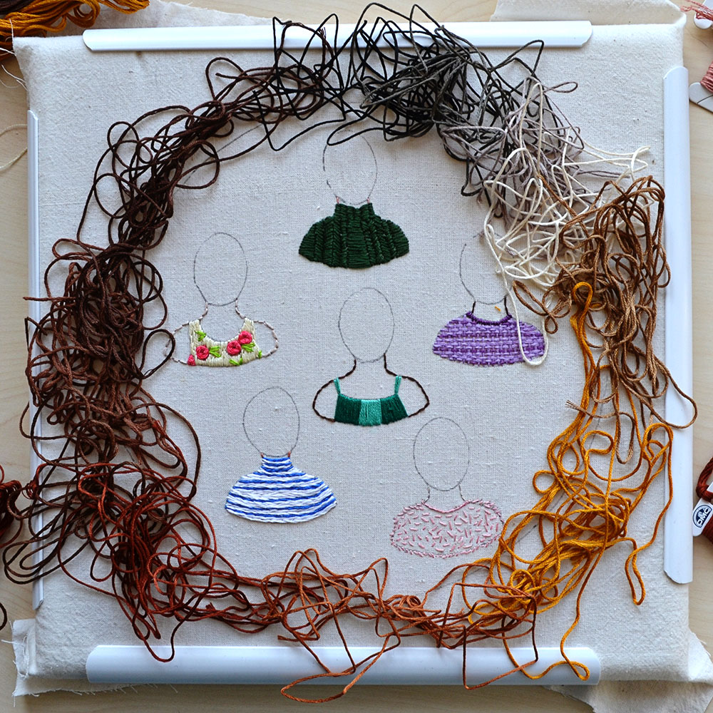 I'm using regular 6 stranded embroidery floss. In most cases, this is a good choice because you can separate the single threads and the embroidered hair will look much more like real hair. With thicker threads, it can look more rope-like.